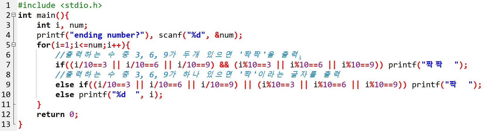 if((i/10==3 || i/10==6 || i/10==9) && (i%10==3 || i%10==6 || i%10==9)) printf("짝짝 ");