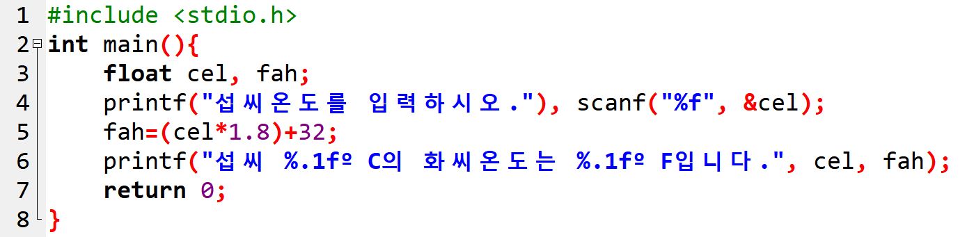 printf("섭씨 %.1fºC의 화씨온도는 %.1fºF입니다.", cel, fah);