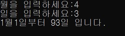 [도전 25일차] 아래의 출력화면과 같이 1월 1일부터 입력한 날까지의 날짜수를 계산하는 날짜 계산기 프로그램을 작성하시오. (단, 2월은 28일로 한다.)